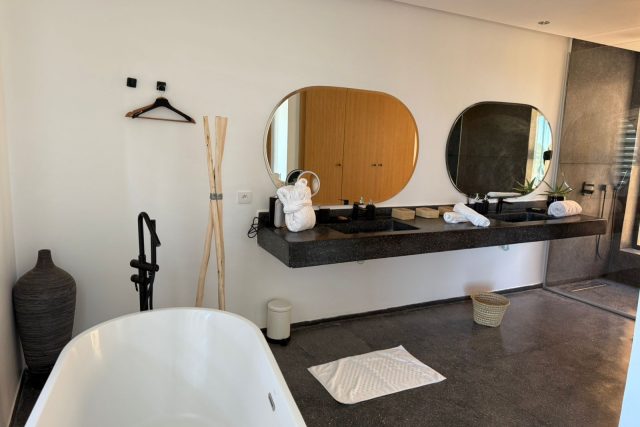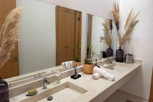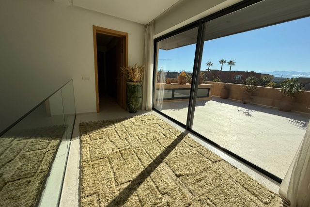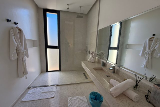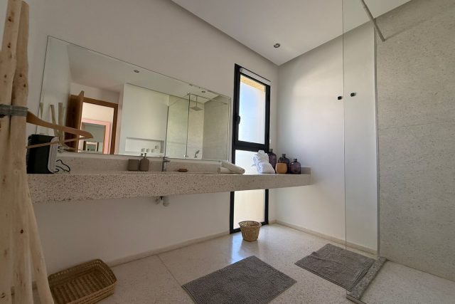 A l’étage: 2 Chambres chacune avec SDB privative, 1 Master avec sa SDB privative avec baignoire, Dressing et grande Terrasse.