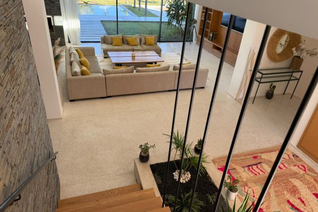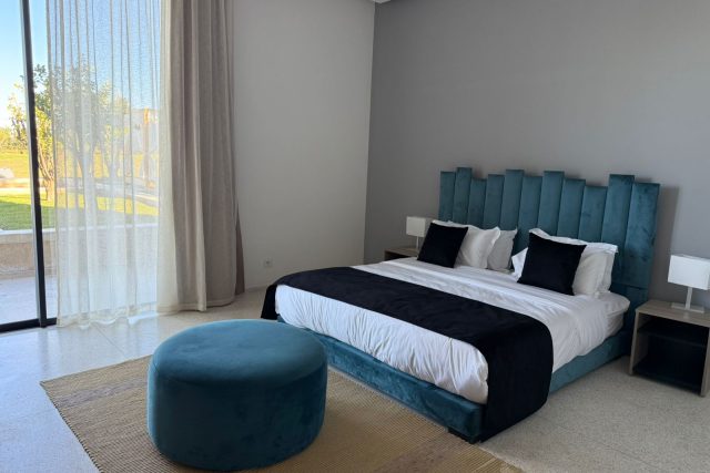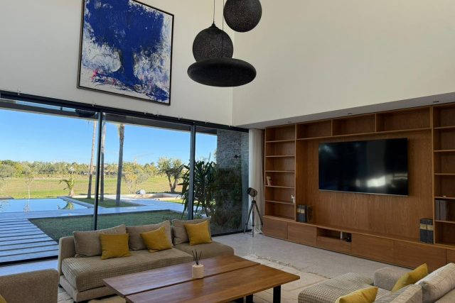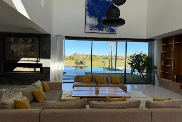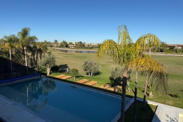 Au RDC : Grand Salon avec cheminée, SAM donnant sur la piscine et le Golf, deux Chambres chacune avec SDB privative, Terrasse, Cuisine équipée.