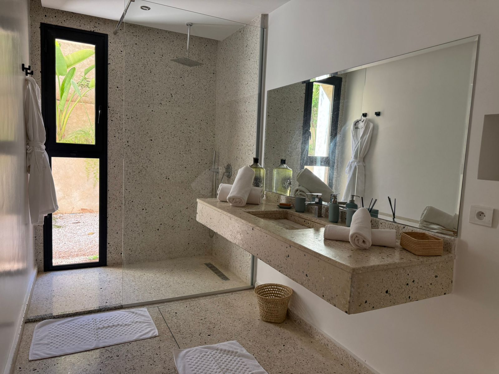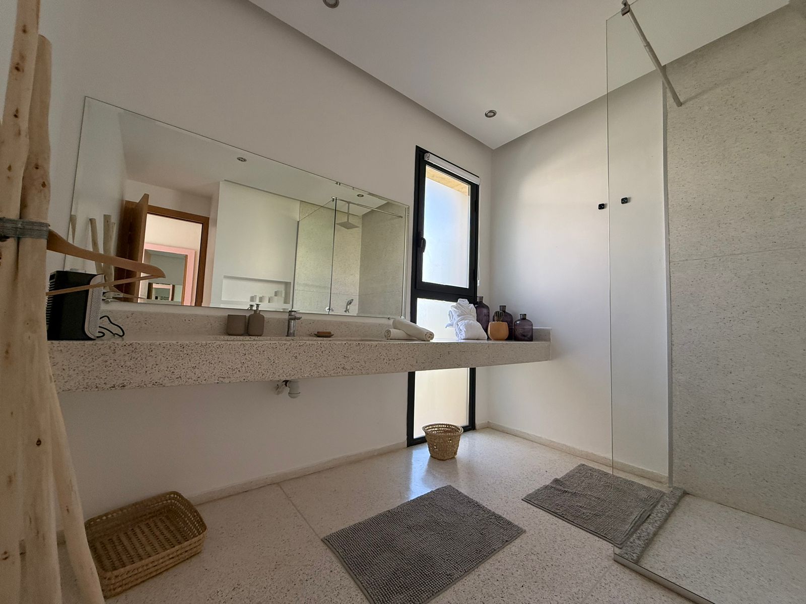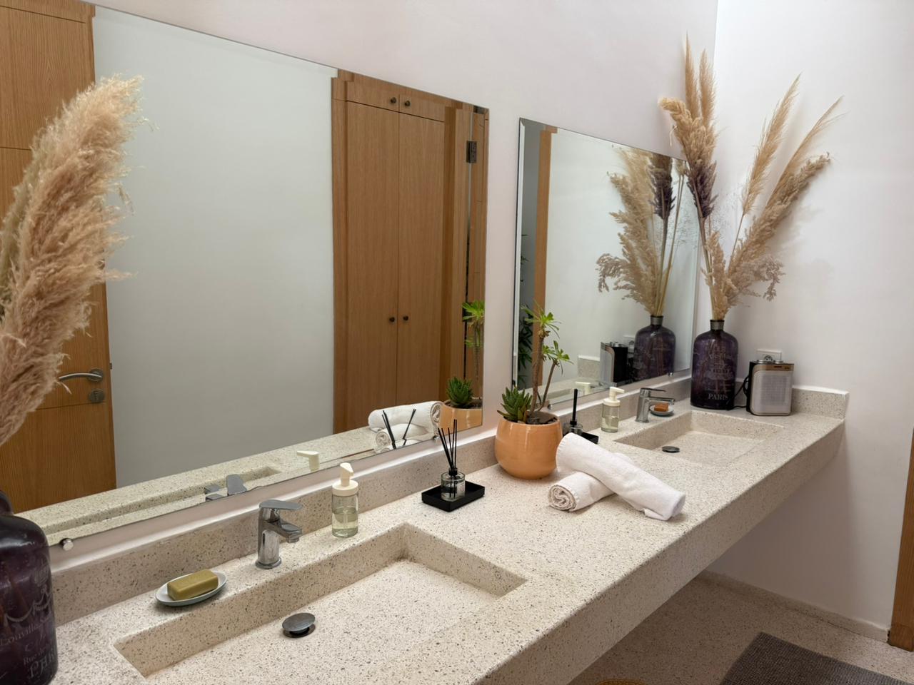 A l’étage: 2 Chambres chacune avec SDB privative, 1 Master avec sa SDB privative avec baignoire, Dressing et grande Terrasse.