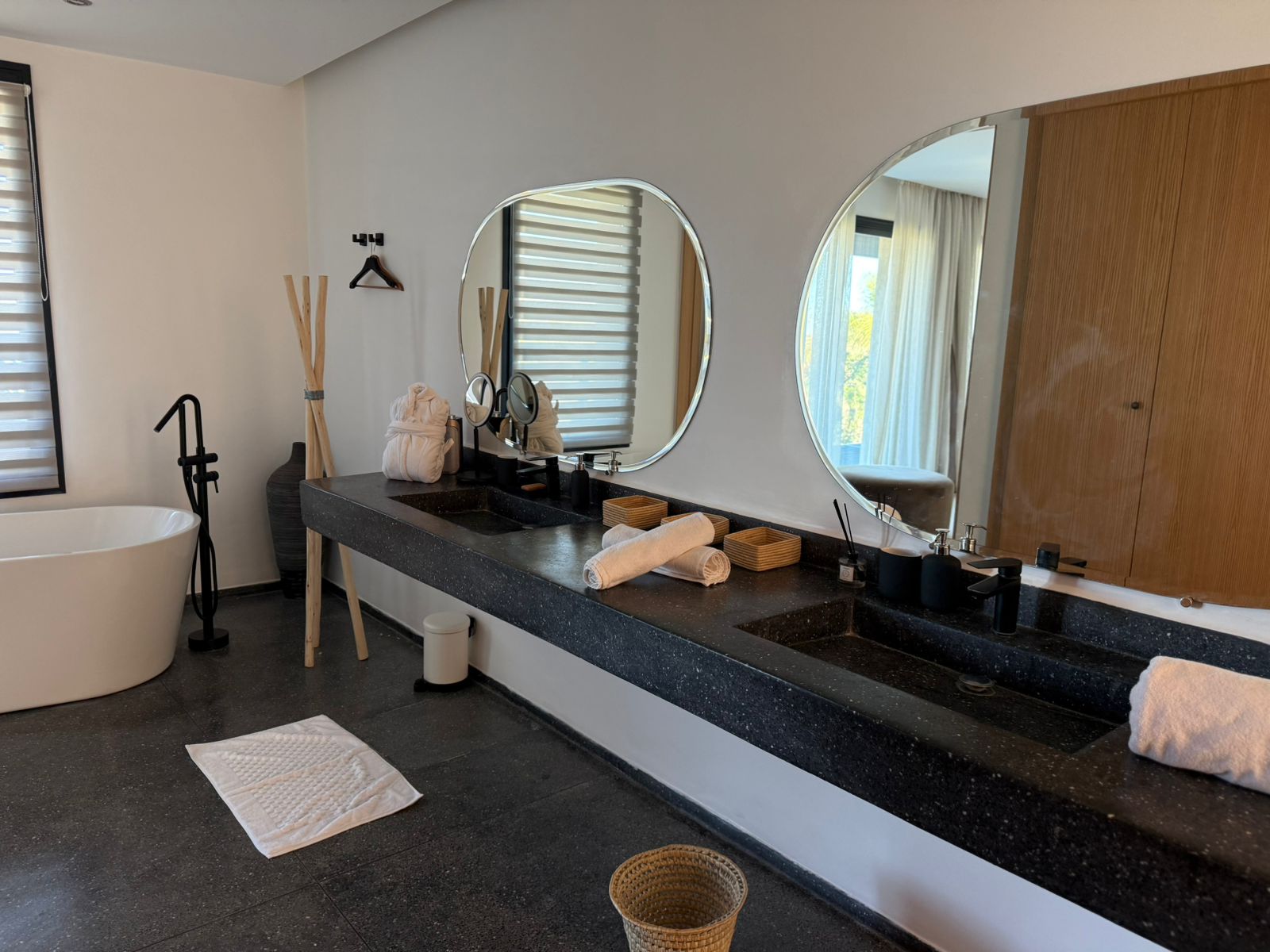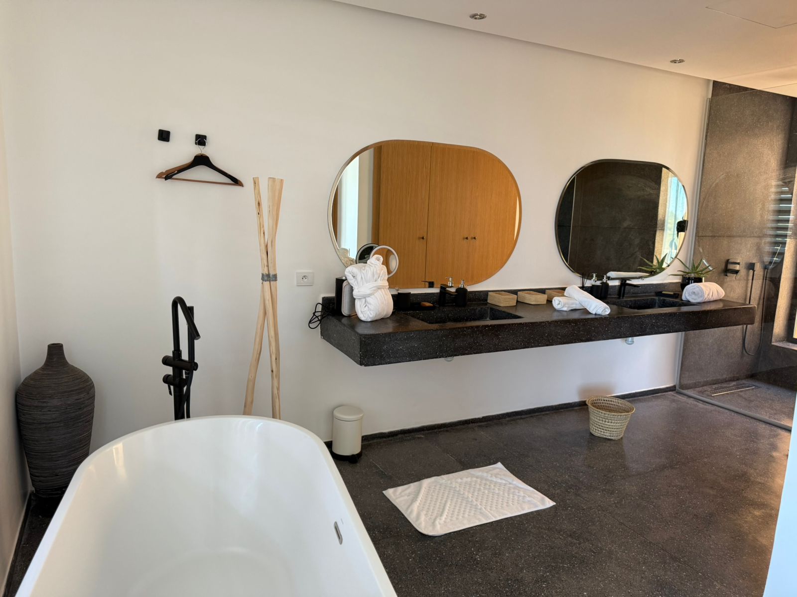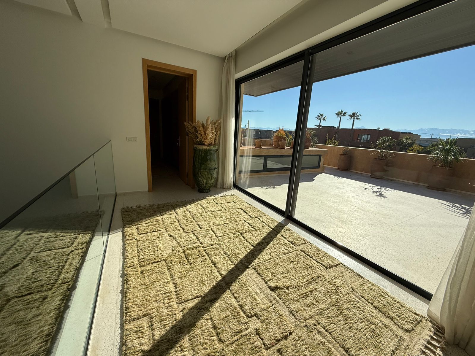 A l’étage: 2 Chambres chacune avec SDB privative, 1 Master avec sa SDB privative avec baignoire, Dressing et grande Terrasse.
